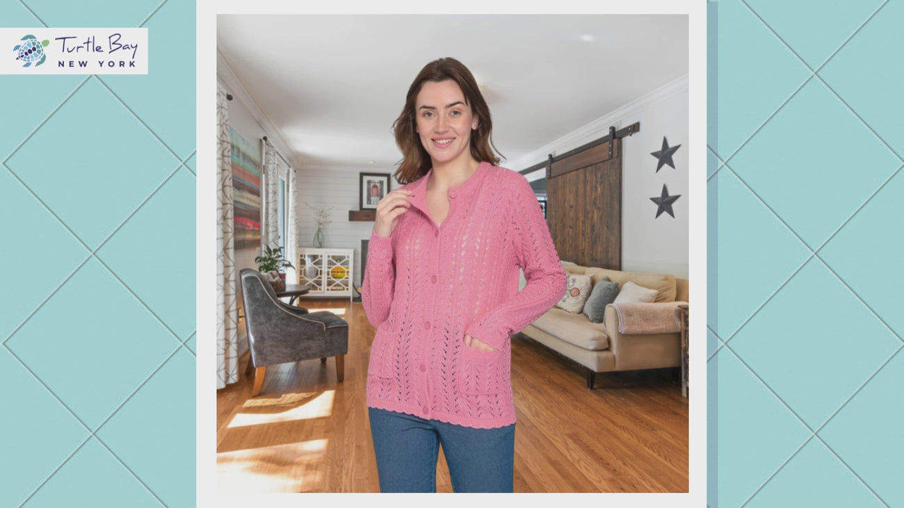 Women's Button Front Crochet Pointelle Cardigan with Pockets