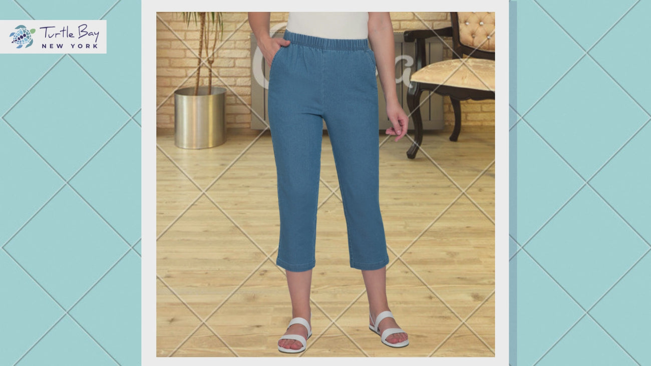 Our Women's Denim & Twill Stretch Capris are the perfect choice for lounging in style. Crafted from a lightweight tri-blend fabric of cotton, polyester and spandex, these capris offer the ultimate comfort with just the right amount of stretch. Designed with angled pockets for easy access and an elastic waistband for effortless wear, these capris eliminate the hassle of zippers and snap buttons. Pair them with a smart top, casual shirt, or tunic for a relaxed look, perfect for a garden picnic or casual outings.